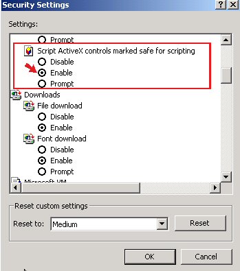 - Change the setting Script ActiveX controls marked safe for scripting,