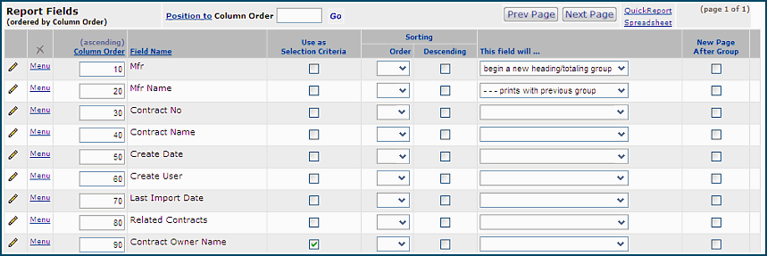New Page After Group - Select this field to put a page break after each group that you have identified. In the example (Figure 8), you may want to put a page break after the data for each manufacturer, if there are a lot of contracts.