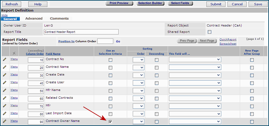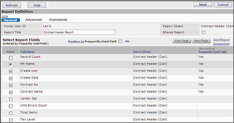 Note: If you need to add more fields to your report, click the Select Fields button on the top of the report. Sourcing and Contract Management again displays fields for you to select.
