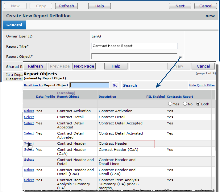 Sourcing and Contract Management reports are based on report objects. A report object is a logical view into the database. Report objects combine related data from database tables. Each report definition uses a report object to identify the data for the report. Report objects have associated fields that you can select when you create a new report definition.