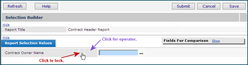 - If you wish to compare the field to another field, choose an operator, and click Show on the Fields for Comparison box. A list of selectable comparison fields appears.