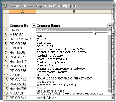 Click the button to view and select a filter for the column. For example, in the Contract column (Figure 13), you might wish to sort the contracts in descending order. When you select the filter, Excel displays the data filtered as you specified.