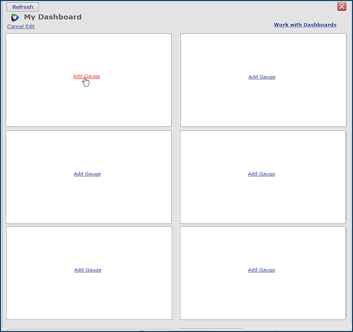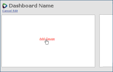 The first time that you click Dashboards > My Dashboard, the default dashboard My Dashboard appears. The Dashboard Edit panel contains blank spaces for you to insert gauges (Figure 6). The dashboard labeled My Dashboard will be your primary dashboard (you can create others).
