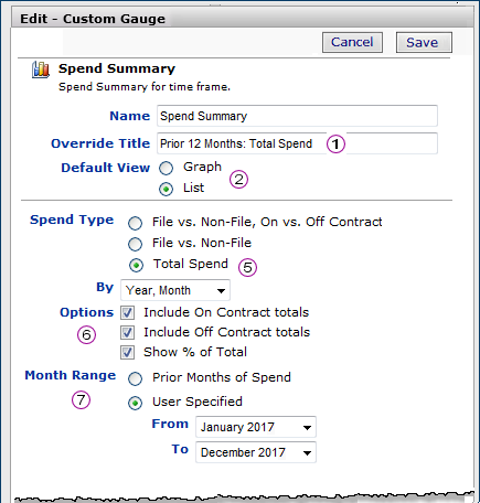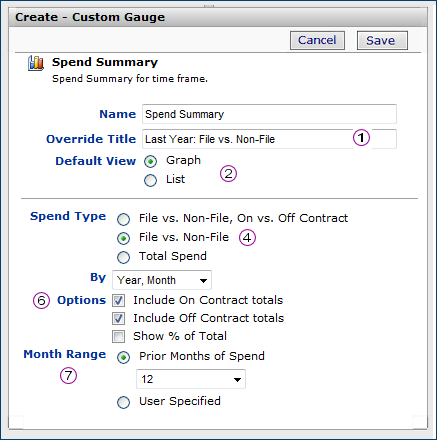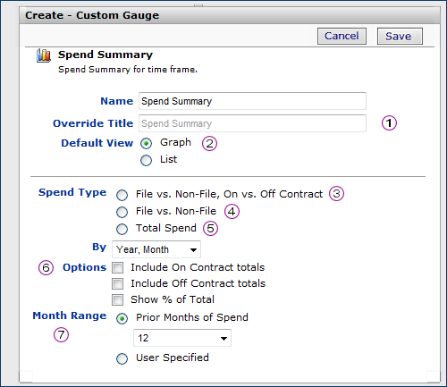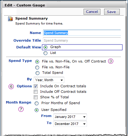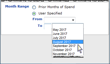 For the Month Range, if you select Prior Months of Spend, click the down arrow to choose a number of months. Spend is displayed on gauges for full months. Alternately, you can select User Specified, which opens the From and To fields: select a From month/year and a To month/year