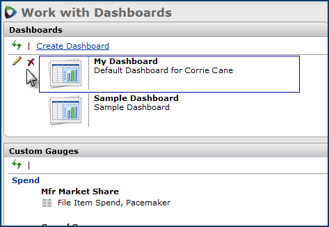 The Dashboards feature lets you copy pertinent gauges to a central location so that you can track changes efficiently. You can create multiple dashboards, and include the same, or different gauges on each. The gauges that you insert on a dashboard are updated dynamically. For example, a graph that displays spend data is updated as spend dollars increase.