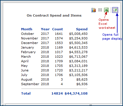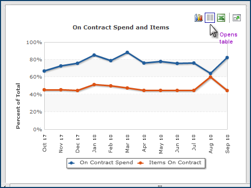 For gauges on a dashboard, and for the same gauges in various parts of the application (such as in supply contracts Projects), you have the option of displaying information in several forms: as a table, graph, or Excel spreadsheet.