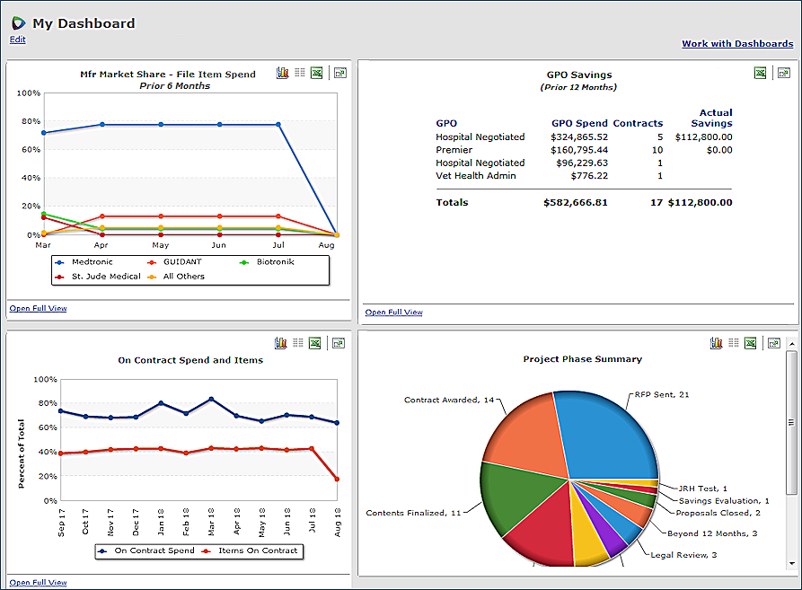 Dashboards are collections of gauges -- such as spend graphs and tables -- that you wish to locate together in a convenient place for easy monitoring. This section describes how to create and access dashboards for reviewing and analyzing contract spend, savings, manufacturer market share, incentives, and progress on contracting projects.