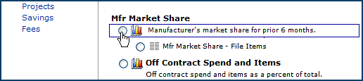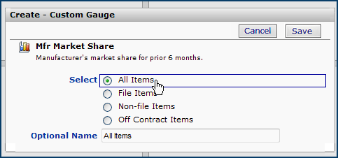 For some gauges, such as Mfr Market Share (Figure 8), a selection list for the type of items or spend appears (Figure 9A). You may need to specify other parameters as well for some gauges; for example, a range of months for which the system should display data.
