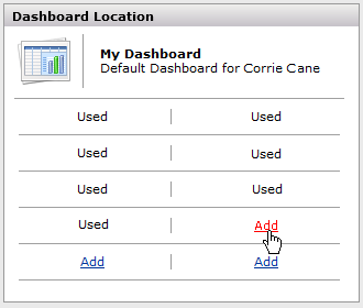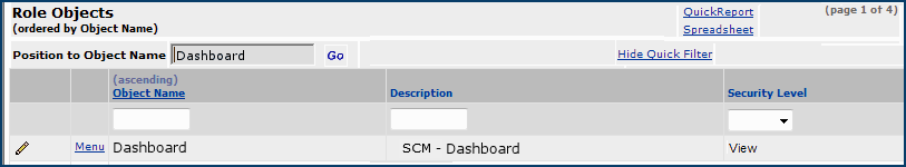 Note: The user's "Dashboard" security role object must be set minimally to View. If security is set to None, Dashboard does not appear in the table of contents for the user.