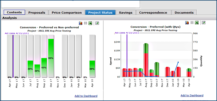 For example, in Figure 20, a project has a contract activation date established for an awarded contract. The Conversion gauges on the project Status panel display how much of each subsequent month's spend occurs on the new contract. You can add one or more gauges to a dashboard so that you do not need to open the project whenever you wish to view conversion rates.