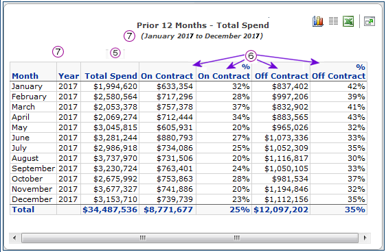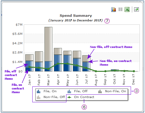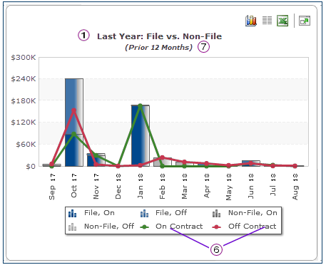 Spend Type: File vs. Non-File, On vs. Off Contract - Displays file, non-file, on-contract and off-contract spend comparatively for the time period.