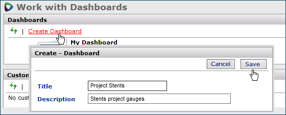 When the Dashboards feature is enabled, the ability to add gauges to a dashboard is available. The Dashboards menu element appears on the SCM main Contents, and users can work with it.