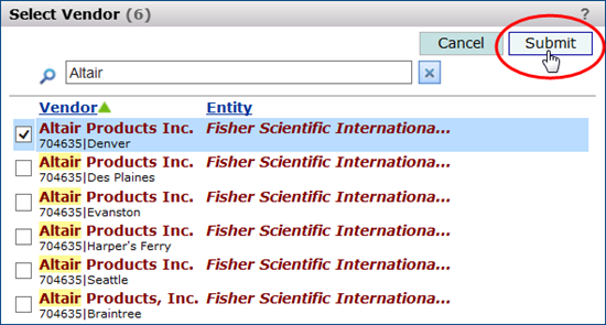 - Select the checkbox next to the name of the vendor that you want, and click Submit. (Figure 21)