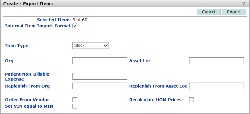 - If you select the checkbox for Internal Item Import Format, you want to export the list of items in a format that ERP Materials Management uses to import items to your item catalog. See Step 5B.