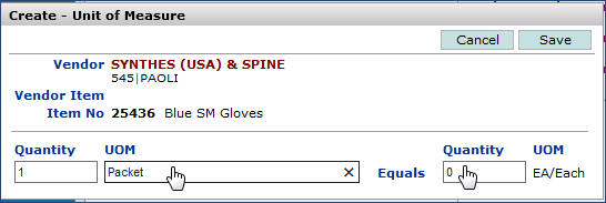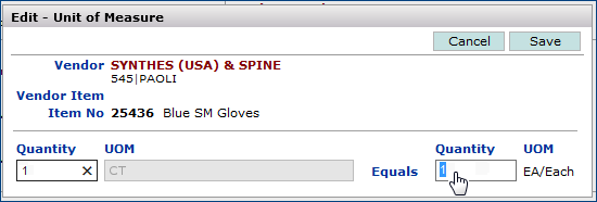 - Specify the conversion factor: enter a Quantity (on the left) that equals the lowest unit-of-measure Quantity (on the right). For example, if you were adding 1 "BX/box," it might contain 10 "EA/each."