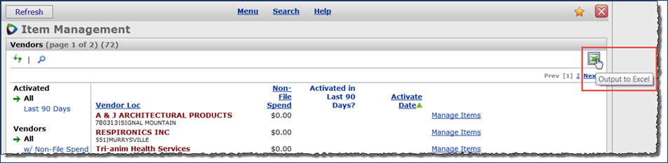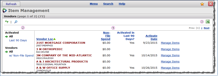 to filter the list. The filters are Activated (All / Last 90 Days), and Vendors (All / with Non-File Spend). See Tools on the Item Management for Vendors Page.