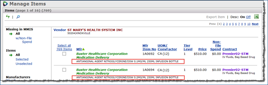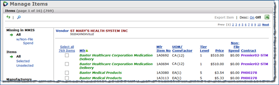 The filters for the list are Missing in MMIS (All / with Non-File Spend), Items, Manufacturers, and Contracts.