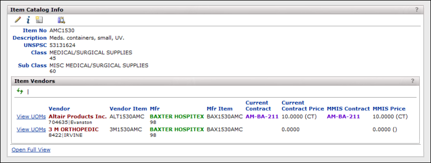 The Item Catalog Info panel lists all the vendors and manufacturers that supply the item, along with contracts where the item is matched.
