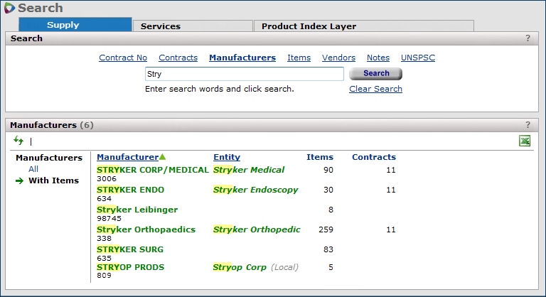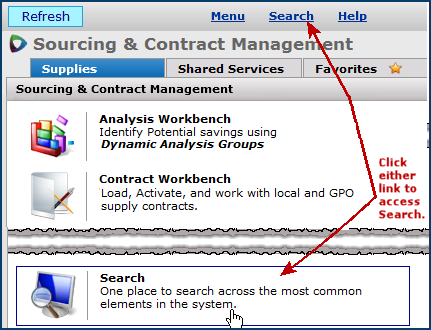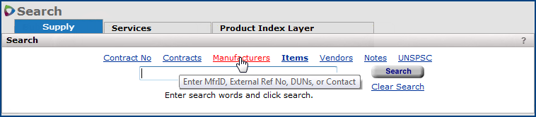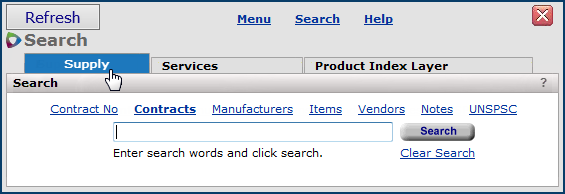 On the menu at the top of any page, click Search to find and display supply contracts, manufacturers, items, vendors, contract notes, UNSPSC codes, services contracts, and Product Index Layer items.