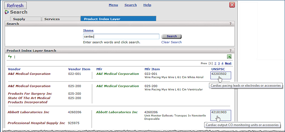 In Figure 9, the user is searching for items that contain the characters "cardiac." Notice that the search did not return any items with "cardiac" in their vendor or manufacturer item numbers or item descriptions, but did return items with the UNSPSC code description that contains "cardiac."
