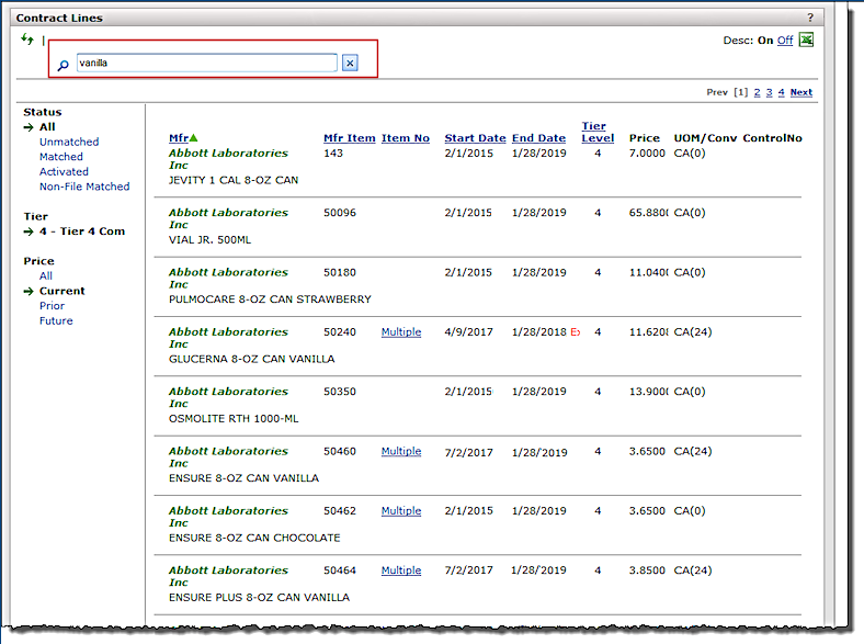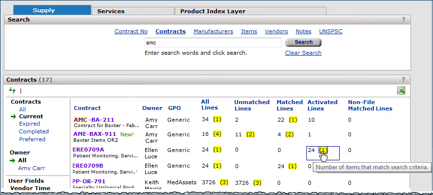 If no items with the search characters are found, the appropriate column only displays the item counts (with no value in parentheses). For example, contract AME-BAX-911 in Figure 3 has no activated lines that contain the search characters.