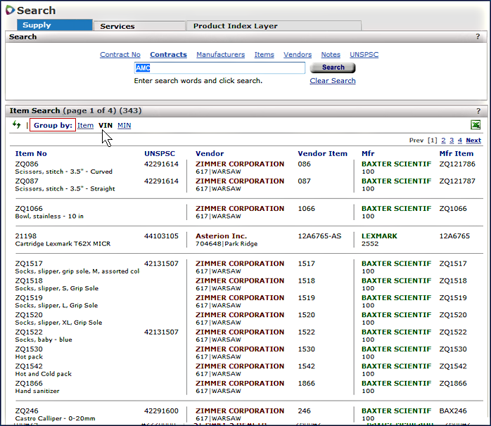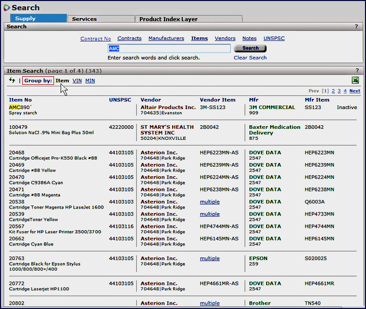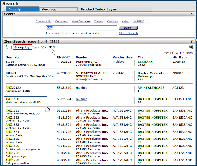 The search results are initially grouped and sorted by manufacturer item number (MIN) (Figure 4). However, you can change the display to show results sorted by Item number, or by vendor item number (VIN).