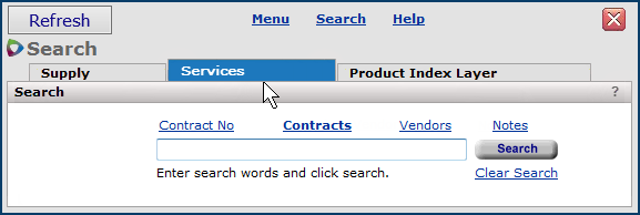 Searching from the Services tab locates services contracts and notes associated with a contract, or the contract;s supporting documents. You can also search for services vendors, as described previously.