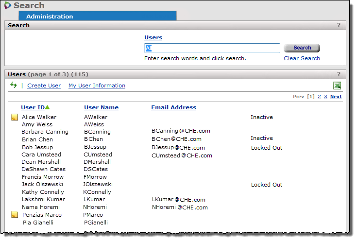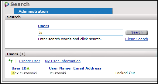 The User Search is available from the Administration menu, as described subsequently.