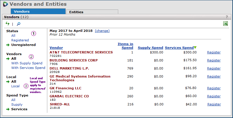 - Vendor displays spend for each vendor entity that has spend. (Local) appears next to any vendor entity that is local.