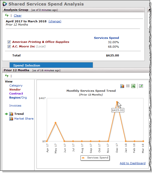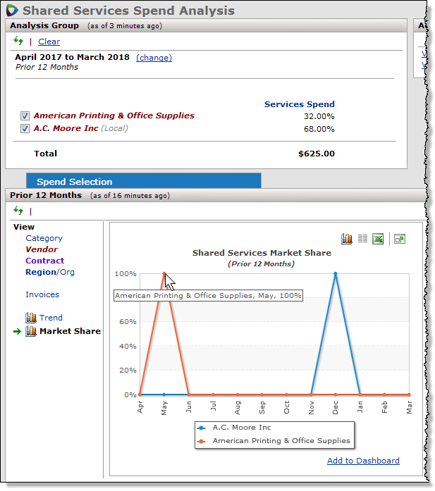 From the graph, the spend segment provided by American Printing was 100% in May. For A. C. Moore, it was 100% in December. The spend for both vendors was flat in other months. If you wished to expand this analysis group to see spend for other vendors in the same services Category (or different categories), or for any group of Vendors, you could do so. Similarly, you could look at vendor market share if you had used Contracts to create the analysis group, or if you had used Regions/Orgs. When more spend dollars exist for the months in the graph, you would see additional lines representing the vendors and percent spend.