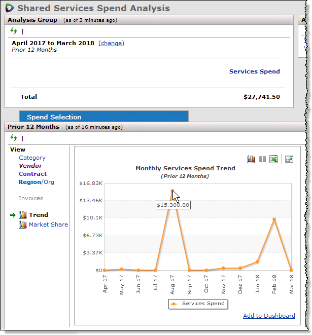 The Services Analysis feature provides tools for segmenting services spend dollars for analysis. Vendors of services contracts are assigned services categories. You can select services categories to segment and examine spend. You can also look at spend for individual vendor entities, regions/organizations, and contracts. You can also work with all spend.