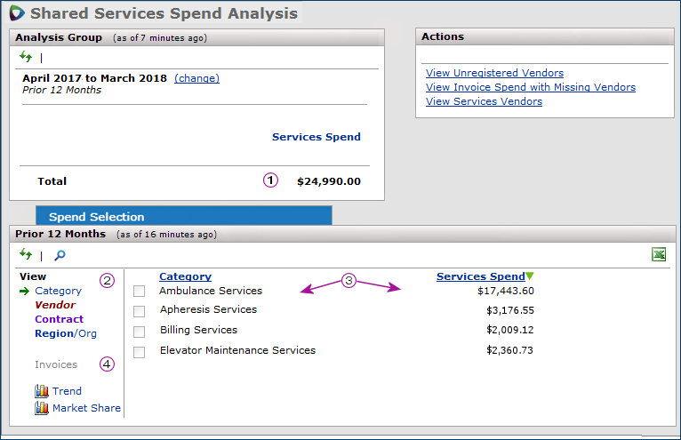 Category displays spend by each category that has spend. If a registered vendor has no category assigned, then its spend cannot be displayed, and you cannot analyze it. (For this reason, when you register a services vendor, be sure that you select a services category.)