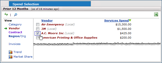 The Views -- Category, Vendor, Contract, and Region/Org -- let you specify how spend dollars are displayed.