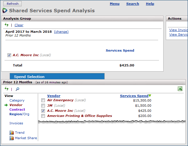 If you know that you have spend for a services vendor, but the spend is not displayed (on the Prior 12 Months panel), the vendor may be unregistered. Spend for unregistered vendors is not available for analysis.