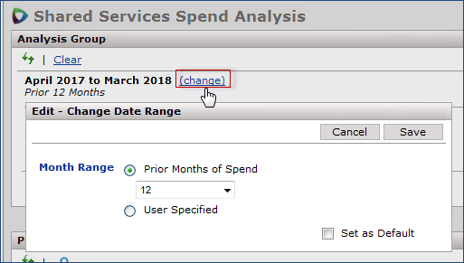 The Prior X Months panel (Figure 1, bottom) shows spend organized according to the Views on the left, and for the time period that you set on the Analysis Group panel (by clicking change).