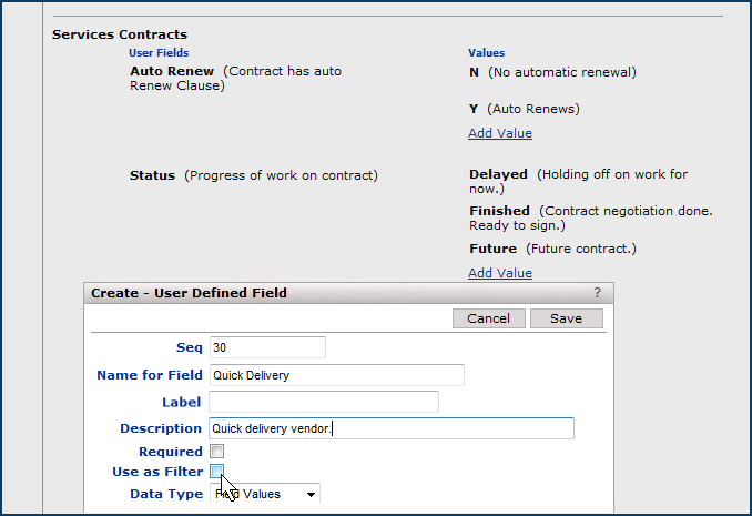 You can designate user fields as filters for the Services Contracts or Supply Contracts list. The fields must be of the data type Field Value.