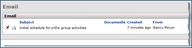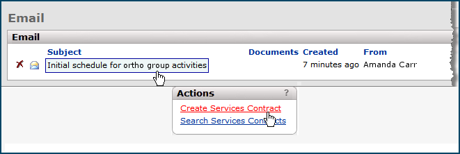 - A Correspondence panel lists emails associated with the contract, and lets you send emails to the contract.