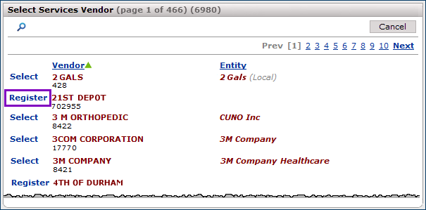 Shared services contracts use vendor entities, rather than vendor locations. Vendors for services contracts must be registered; that is, each vendor location must be cross referenced to a vendor entity in the Product Index Layer. When you select a vendor for a services contract, if the vendor is not registered, you can create the registration.