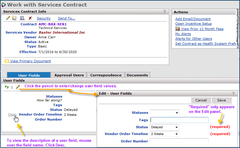 - You can specify the order of user-defined fields, and flag any that should be used to filter the Services Contracts list.