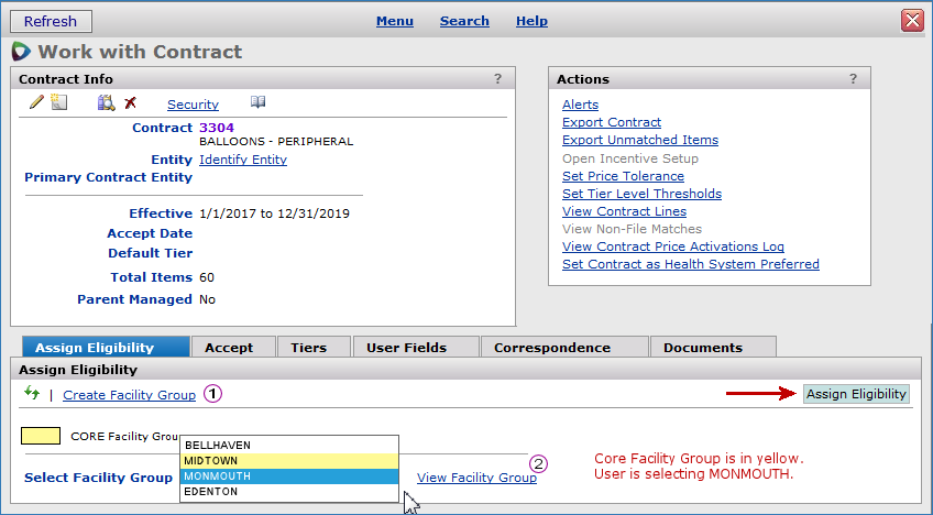 An implementation flag determines whether contract eligibility is always assigned to the Core Facility Group. When the flag is set, the Core Facility Group is the default for local contracts. You can accept a local contract without further action if you are happy with the default.