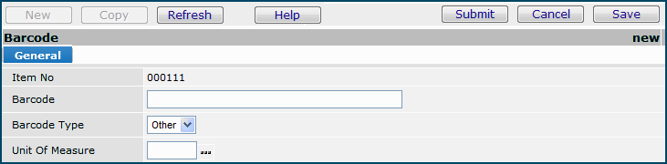 4. When you finish entering data, click Submit. Supply Chain returns you to the Barcode list. Click Refresh to see your new barcode.