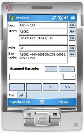 To use ProScan, you download item records identified for a physical inventory to the hand-held computer, position to an item record, scan the item's barcode, and assign the barcode to the item record. When you are finished, you upload the item records to Supply Chain. Supply Chain updates the asset location ("inventory") information, which includes the barcode.